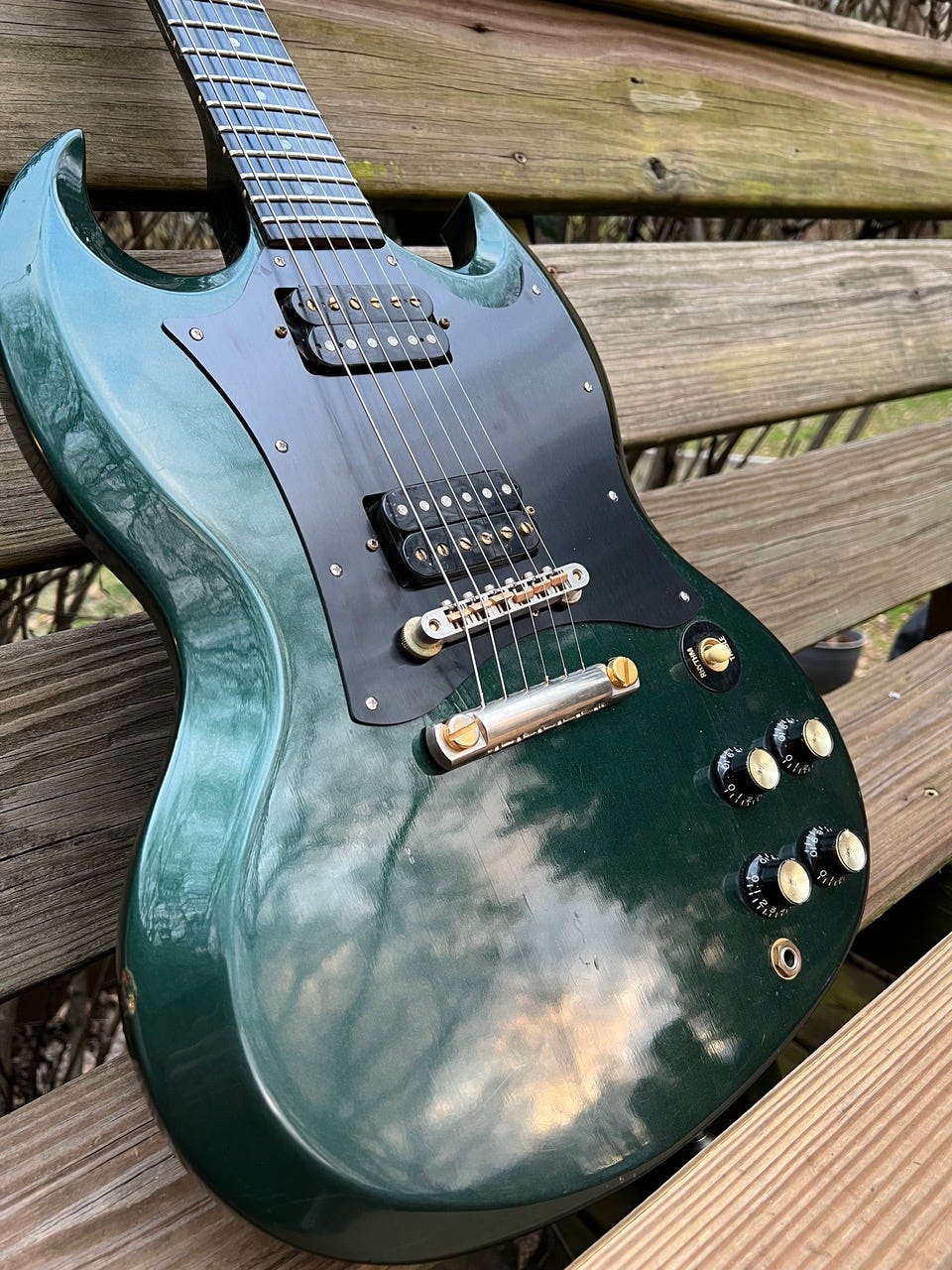 I can’t recall which pair of SD pickups were tossed in this one but it rips. Everything about it feels just right, and Bacchus really did a good job with these. It is one of the more recent additions to the collection. I had another cherry SG Standard for a time, but I’m a fan of the more eclectic finishes.